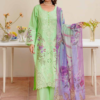 You can never go wrong with black. This outfit features a midnight black luxury cotton lawn base, beautifully contrasted with elaborate beige/gold thread embroidery. The intricate patterns along the shirt front and sleeves add a touch of luxury. Styled with modern wide-leg trousers and a stunning printed dupatta, this piece is the epitome of modern elegance.