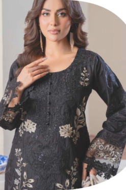Midnight Black Luxury Lawn Suit with Contrast Beige Embroidery