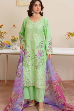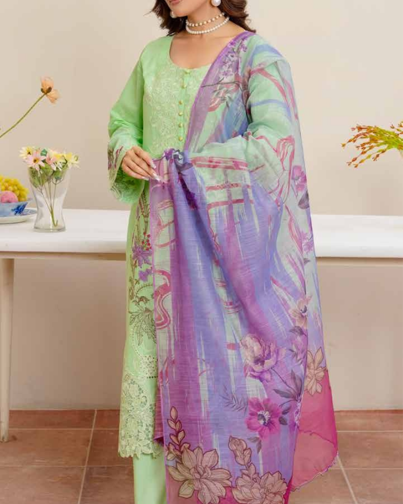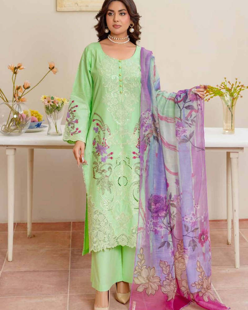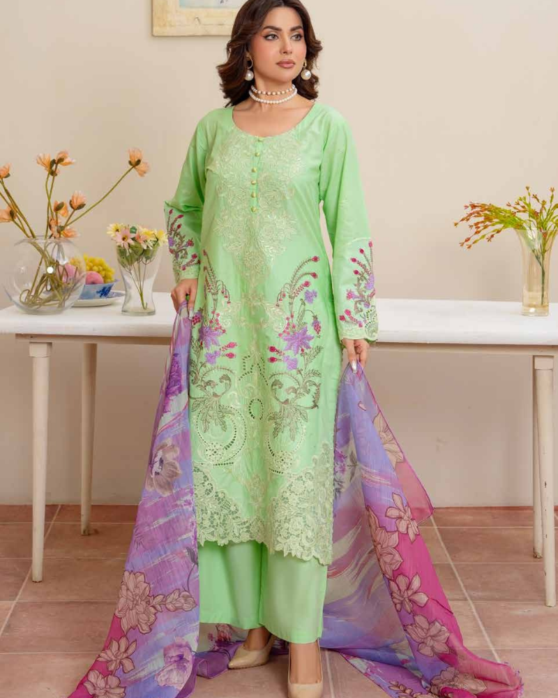 A refreshing mint green cotton lawn suit adorned with delicate purple and pink floral embroidery for a breezy summer look.